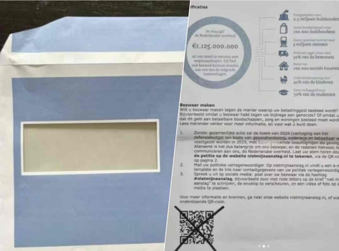 تتضمن الصفحة الثانية من الرسالة دعوة للقراء لتوقيع عريضة ضد التعاون العسكري المذكور. وظهر أن الجهة المرسلة ليست مصلحة الضرائب، بل مجموعة تسمى “Niet Mijn Aanslag” (ليست ضريبتي)، والتي تستخدم هذه الحملة للضغط السياسي. في أسفل الرسالة يظهر رمز QR، أثار مخاوف كبيرة لدى الشرطة.