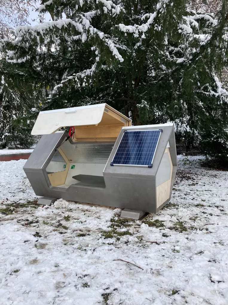 تبدو المقصورة وكأنها كبسولة فضائية من فيلم خيال علمي. ومع ذلك ، تُسمى بـ Ulmer Nest لهذا الوقت ، كمكان نوم بديل للمشردين في أشهر الشتاء. تم تسمية الاختراع على اسم مدينة أولمر االألمانية على نهر الدانوب ، حيث تم استخدام نموذجين أوليين لكابينة النوم لمدة عام كتجربة.