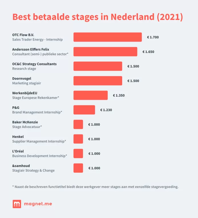 يقوم Magnet.me بإجراء بحث كل عام منذ 2018 في تعويض التدريب الداخلي للشركات التي تقدم وظائف شاغرة على المنصة. يقول المؤسس المشارك لاورنس : “التدريب الداخلي هو جزء مهم من تنمية الشباب”. لهذا السبب نعتقد أنه اتجاه جيد أن تكون الرواتب والتعويضات أعلى من العام الماضي. نرى العديد من الشركات الاستشارية في العشرة الأوائل مع أفضل التدريبات ذات الأجر ، كما أن التدريب في مهنة المحاماة يؤتي ثماره جيدًا “.