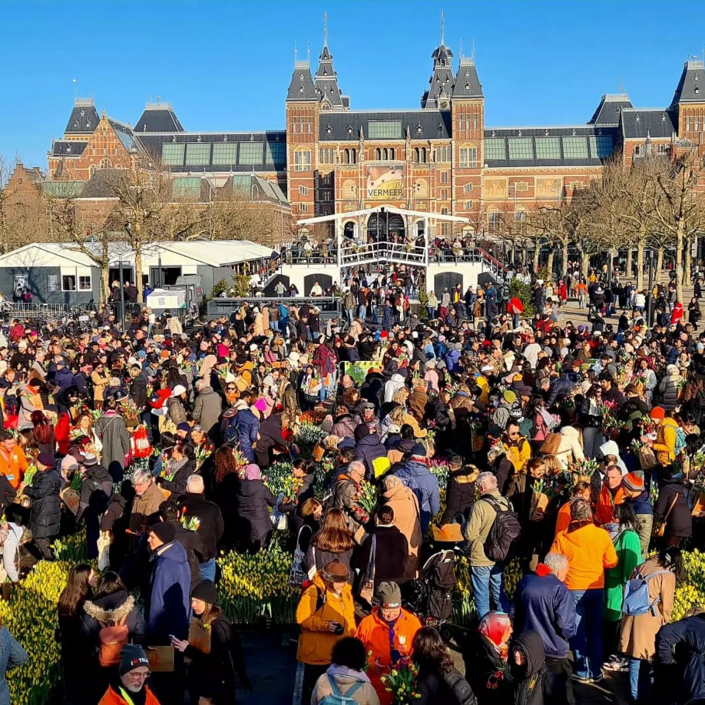 جاء المئات من الناس إلى ساحة المتاحف في أمستردام لاختيار باقة مجانية من زهور التوليب . كان هذا ممكن اليوم كجزء من يوم التوليب الوطني 2023.