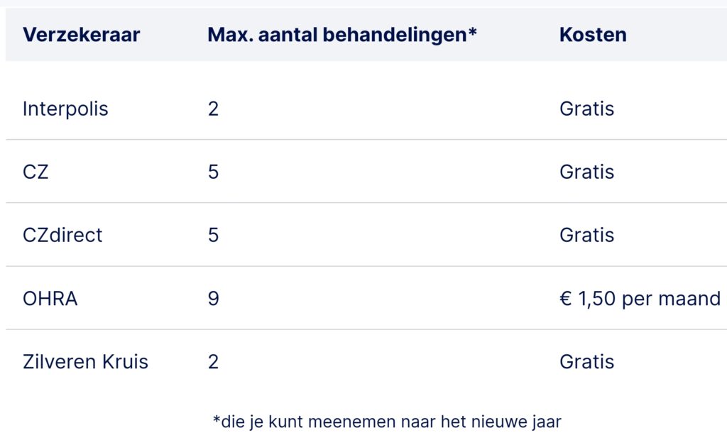 توضح النظرة العامة أدناه شركات التأمين التي تقدم خدمة العلاج الطبيعي في عام 2024، بما في ذلك تفاصيل حول الحد الأقصى لعدد العلاجات الغير مستخدمة والتي يمكنك أخذك معك إلى العام القادم والتكاليف المرتبطة بها.