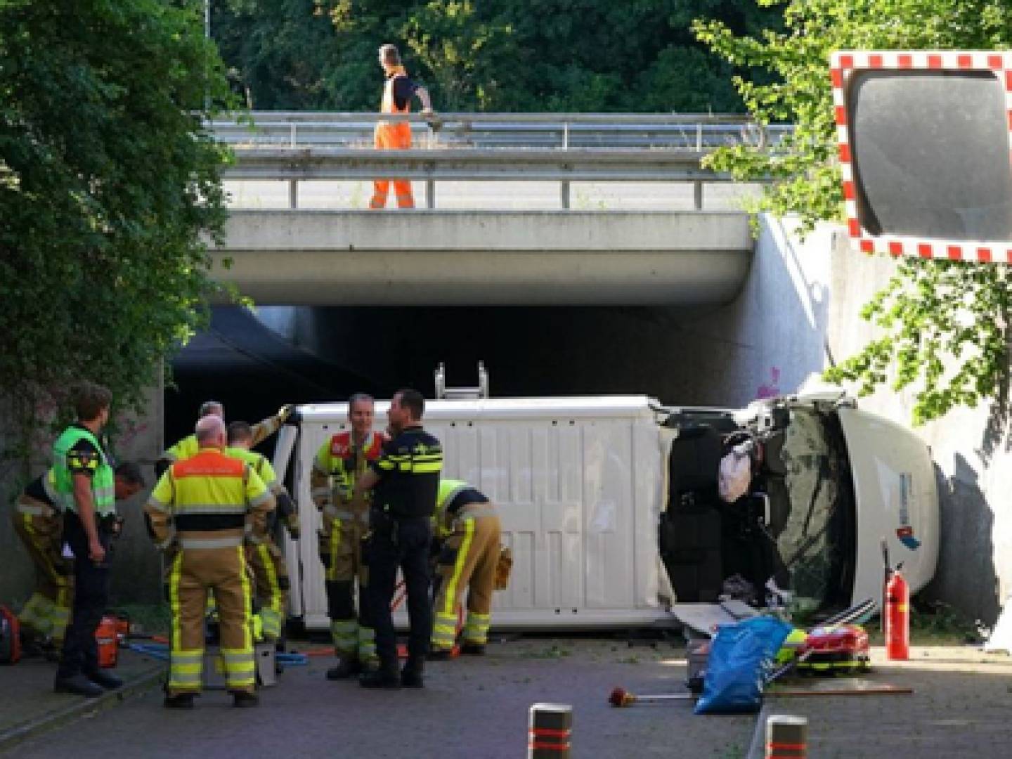 في بلدية Gelderland في Wijchen ، سقطت شاحنة توصيل من جسر. انتهى الأمر بالحافلة على مسار الدراجات الأساسي.