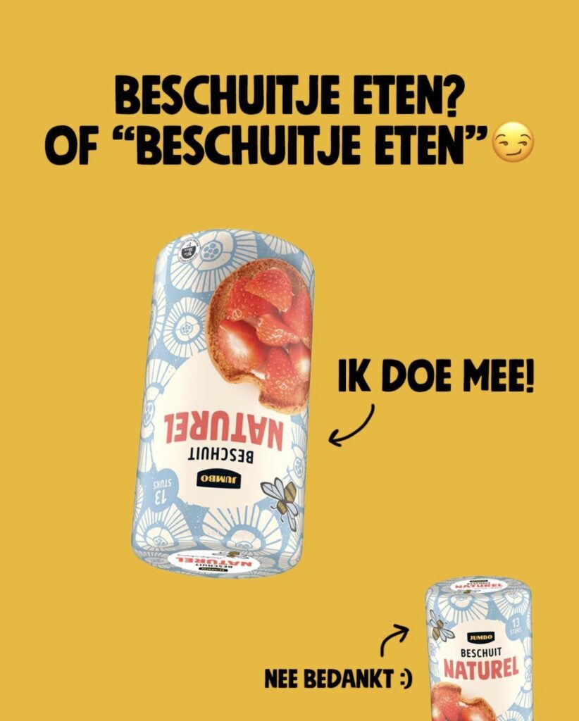 لتشجيع الأشخاص غير المرتبطين الذين يعيشون في هولندا على المشاركة، قام موقع Jumbo بإنشاء مقطع فيديو على موقع TikTok يحتوي على بعض عبارات المغازلة التي يمكنك استخدامها أثناء “ساعة المغازلة”. على سبيل المثال، “Volgens mij mister er iets op je boodschappenlijstje… Ik sta er niet op” (أعتقد أن هناك شيئًا مفقودًا في قائمة التسوق الخاصة بك… أنا لست على القائمة).