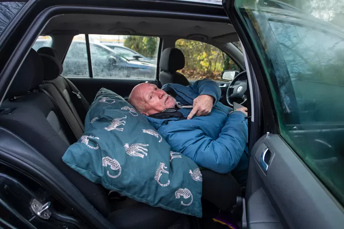 إنه يائس. كوسيلة إلهاء، يستمع إلى الراديو كثيرًا في السيارة. عادة ما يكون النوم ممكنًا، على الرغم من أن النوم في مقعد السيارة ليس مريحًا. “سأترك المحرك يعمل لبعض الوقت أولاً. ومن ثم يصبح الجو أكثر دفئًا قليلاً في الداخل. يوجد في صندوق السيارة جميع أنواع الأشياء والأكياس البلاستيكية مع الملابس، مرتبة وقذرة. احتفظ بها لمدة عام تقريبًا.