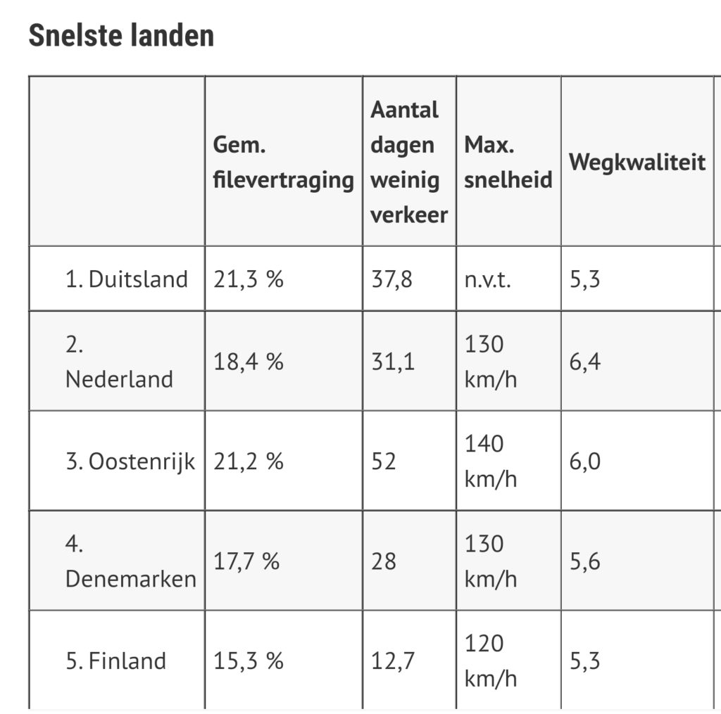 تم التحقيق في العديد من العوامل التي تحدد مدى قدرتك على القيادة بسرعة في بلد ما: متوسط ​​التأخير بسبب حركة المرور ، وعدد الأيام في السنة التي تكون فيها حركة المرور قليلة ، والسرعة القصوى المسموح بها وجودة الطرق. تسجل هولندا نتائجها بشكل أساسي من حيث جودة الطرق والتأخيرات المرورية: “تتمتع هولندا بواحد من أقل حالات التأخير في حركة المرور في العالم ، 18 في المائة فقط ، مما يعني أن الرحلة التي بها اختناقات مرورية تستغرق في المتوسط ​​18 في المائة فقط أطول مما لو لم تكن هناك حركة مرور مزدحمة. .
