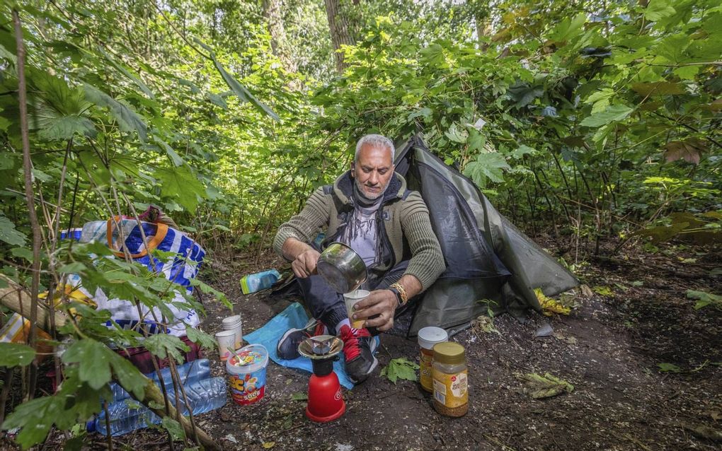 انظر ، هنا أكلت الفئران الخيمة “. يشير كايال إلى الثقوب الموجودة في ملجأه الصغير الأخضر الداكن الذي أقامه في روتردام. مخبأة بين الأشجار ، غير مرئية من ممر المشاة الموجود في الغابة.