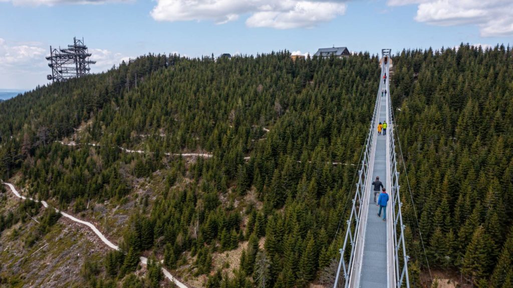 721 مترا طولاً ، 95 مترا ارتفاعاً و 1.2 مترا عرضاً . أطول جسر معلق للمشاة في العالم يفتح الجمعة في منتجع للتزلج في شمال جمهورية التشيك، على الحدود مع بولندا. استغرق الأمر سنتين لبناء جسر سكاي بريدج.