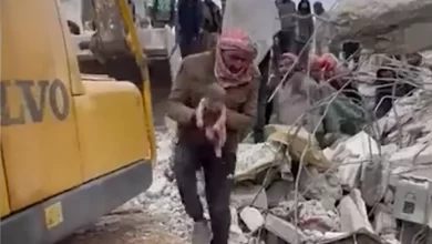 أقارب ينقذون مولودًا جديدًا من تحت الأنقاض في شمال سوريا. كانت الطفلة لا تزال مرتبطة بأمها بواسطة الحبل السري التي…